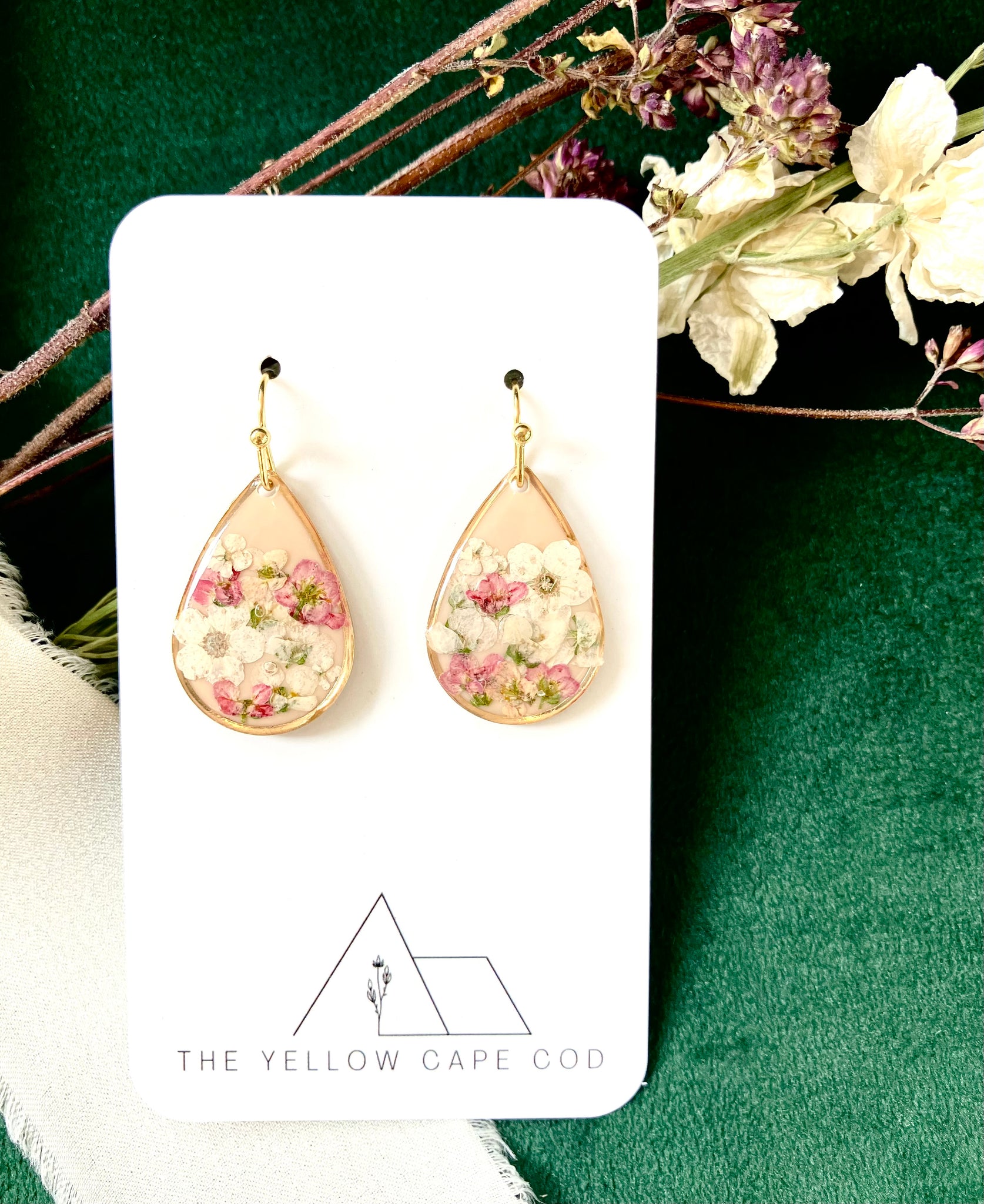 Beautiful, lightweight, hypoallergenic, gold drop earrings. Featuring dried florals. Handcrafted, resin filed, locally sourced. Colours vary depending on availability. Contact us for current in-stock colours.