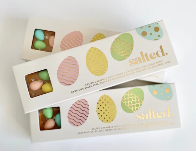 Elevate your Easter celebrations with these indulgent salted caramels. Perfect for Easter baskets, hostess gifts, or savouring during life's little moments. Each box includes four individually wrapped caramels, elevated with candy coated chocolate eggs and a sprinkle of sea salt.