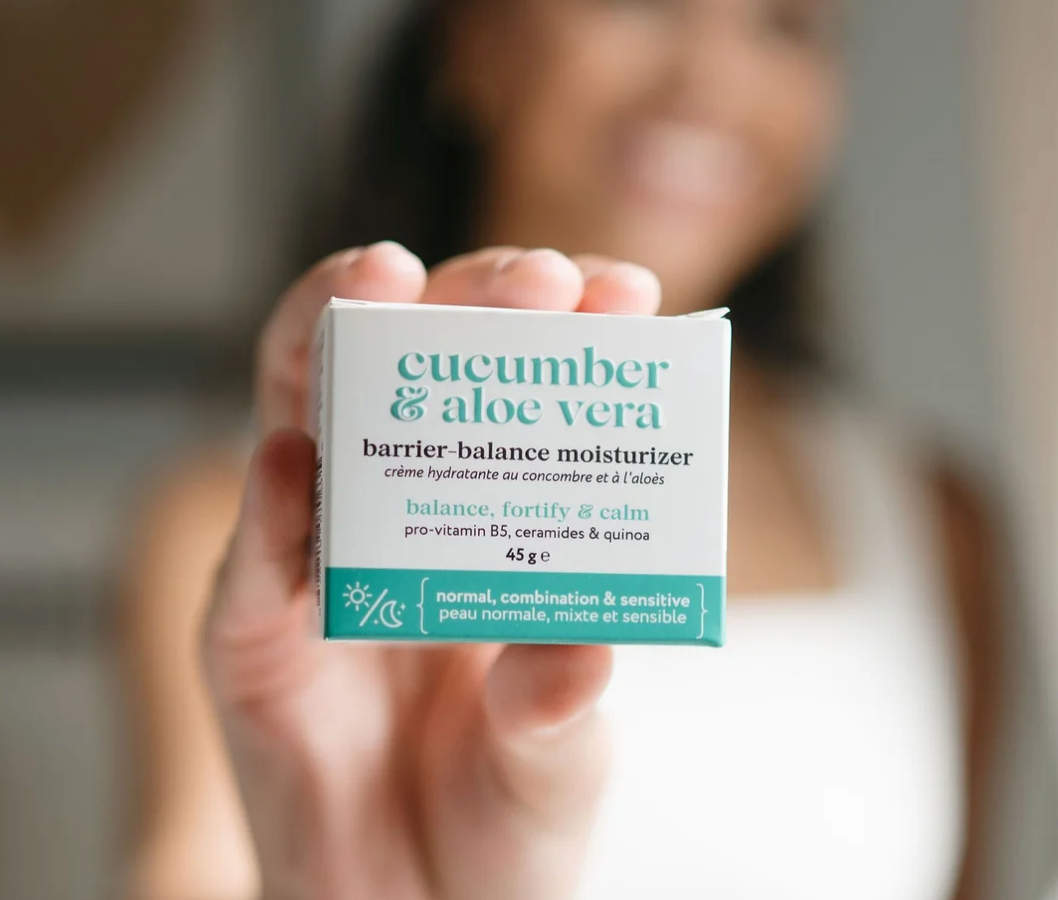 Cucumber & Aloe Vera Barrier Balance: Experience the calming power of Cucumber + Aloe Vera Barrier-Balance Moisturizer, a replenishing cream created to support the needs of normal, combination, and sensitive skin — especially when your barrier feels a little off balance. This lightweight, hydrating formula is crafted to deliver long-lasting moisture, support barrier health, and reduce visible signs of stress or irritation. With a silky, fast-absorbing texture, it provides just the right amount of nourishment — never greasy or heavy — leaving your skin feeling soft, smooth, and resilient.